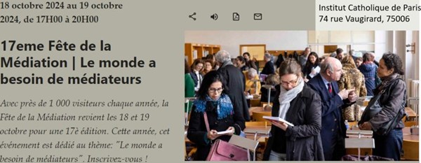Je suis ravi de vous annoncer ma participation à la Fête de la Médiation le 19 octobre à l’Institut Catholique de Paris. Vous me trouverez au stand de mon éditeur « Médias & Médiations » le samedi 19 octobre de 18h à 20h.